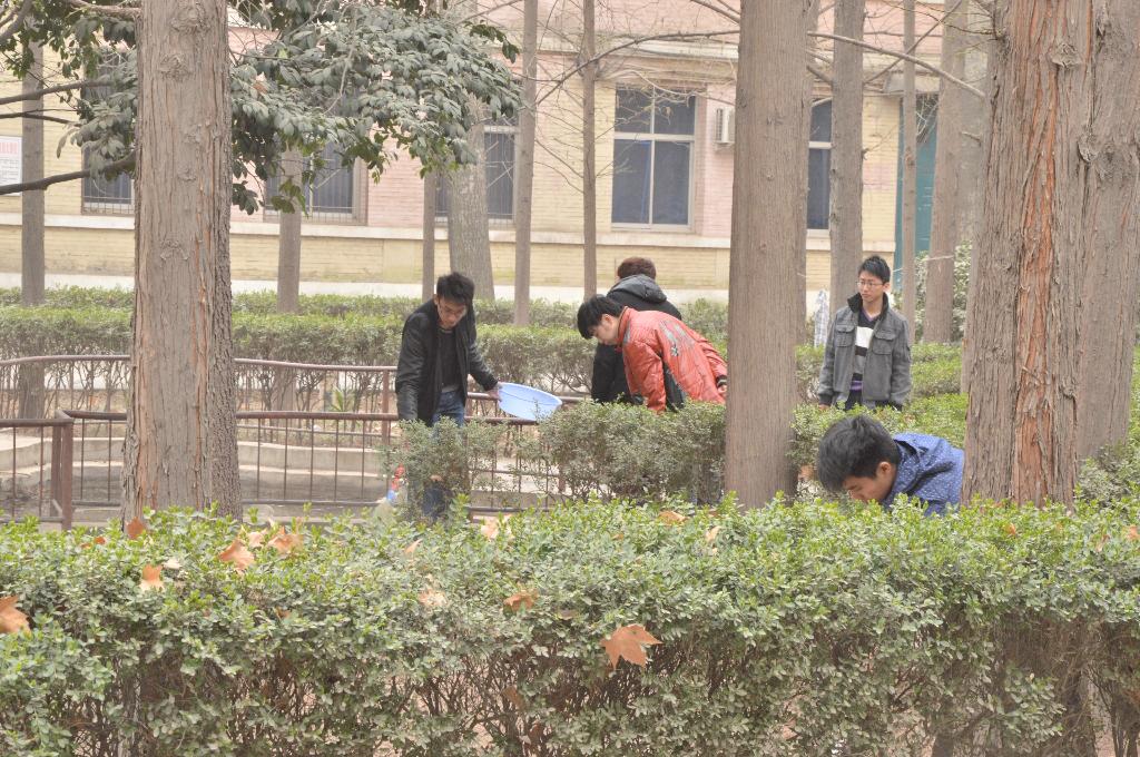 干部在团委书记张晓宾老师的带领下在金花校区进行保护树木、清扫垃