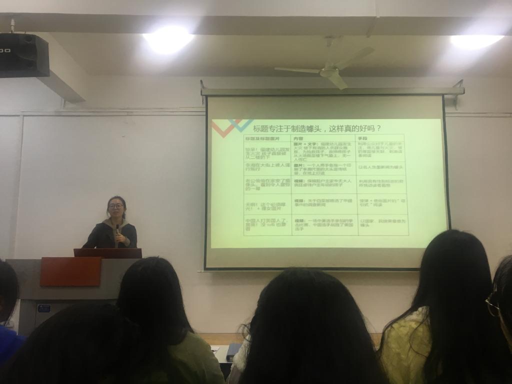 赵彩霞老师从新媒体时代谈起,她说:“新媒体以其独特的功能和魅力强烈地吸引着老员工群体,已经成为老员工获取信息和交流沟通的主要渠道,极大地改变了老员工原有的交往方式、生活方式、思维方式及观念模式”。接着她从文章推送的流程、节点与定位、标题写作、内容写作、推送问题和运营等六个方面,结合生活实例,以幽默的语言和适合年轻人生活交流方式向同学们系统介绍了新媒体的特点和运作方法,着重对于标题的写作、内容写作的视角等进行了讲解。赵彩霞老师说:“标题直接决定着公众号图文信息的打开率和阅读量,这一点是无可置疑的,而且随着公众号数量和推送文章的不断增多,标题的作用只会增加不会减少,一个够吸引人的标题终将获得更多的点击。”她同时谈到:夺目的标题固然可以成为一次流量漩涡的核心,但对于一个媒体人更加不能忘记的是作为发声者的初心,好的推文让大家阅读后的反馈是有温度、有高度、有深度、有收获和有思考。