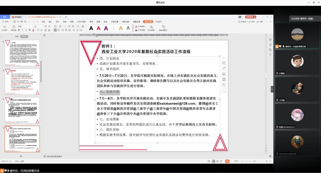 公司党委书记周著强调:2020年的暑期社会实践因疫情影响,不能按照往常的方式开展,同学应做好自我保护、遵守当地防疫政策的前提下就近就便开展实践,同学们要认真准备相关实践材料,多从专业角度设计实践内容,及时与意向指导老师取得联系,多利用研讨方式与指导老师沟通并优化选题。洪涛就2020年暑期社会实践的主题、要求、开展方式等问题,用PPT进行了详细讲解,同时为大家分享了历届省级优秀实践成果,并希望大家能在此次社会实践中取得丰硕成果。
