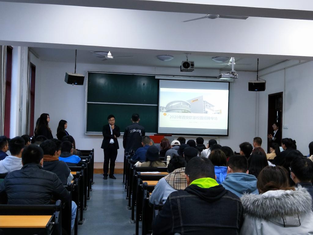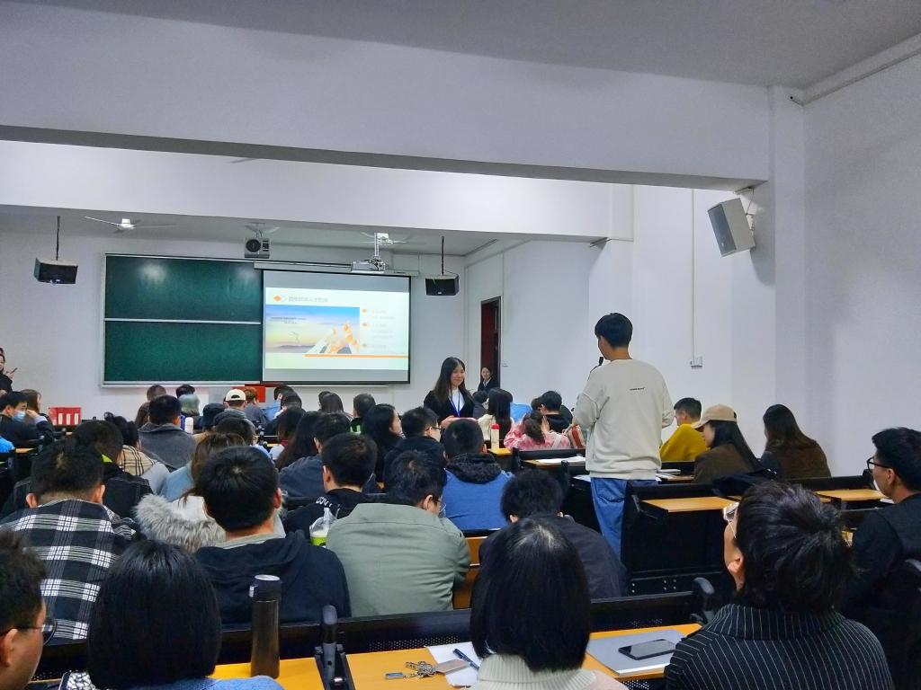 会上,欧派集团西安公司人力资源部郭经理首先对欧派集团做了简要介绍,向同学们介绍了西安公司的发展、团队、具体业务等各方面情况。接着郭经理对公司招聘岗位、校招流程、工作流程、发展平台等做了详细说明,还向同学们展示了公司的福利待遇、团建文化、员工关怀等。互动环节上欧派公司工作人员为踊跃回答问题的同学发送了礼物,往届应聘到该公司工作的员工也回答了同学们