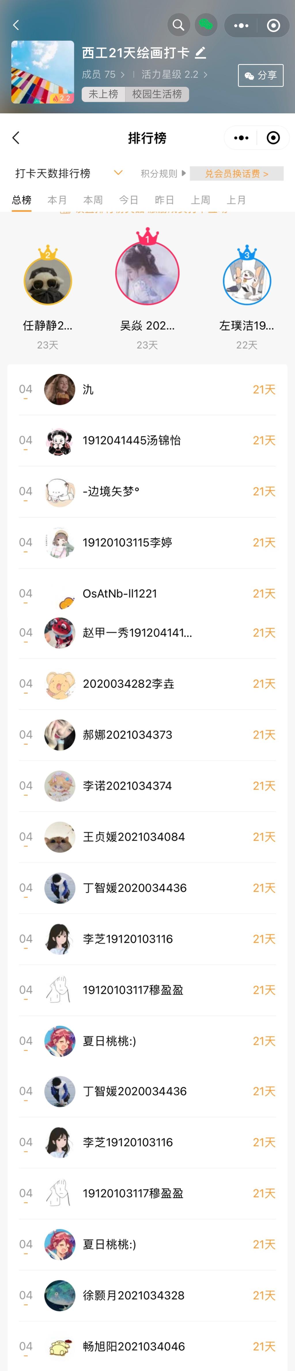 同学们每天坚持在小程序上打卡上传自己当天的作品内容及创作过程的短视频,作品主题主要为西工校园,二十四节气,西安名胜古迹。最终共有20名同学超额完成打卡任务。活动结束后,通过线上投票和专业老师评选相结合的方式相继评选出了一等奖、二等奖、三等奖及优秀奖共十名,并颁发相应奖励。同学们纷纷表示:经过这21天的绘画打卡,不仅提升了自己的绘画技能,同时也收获了好的学习习惯,还感受到为了目标坚持不懈努力的过程,收获良多。