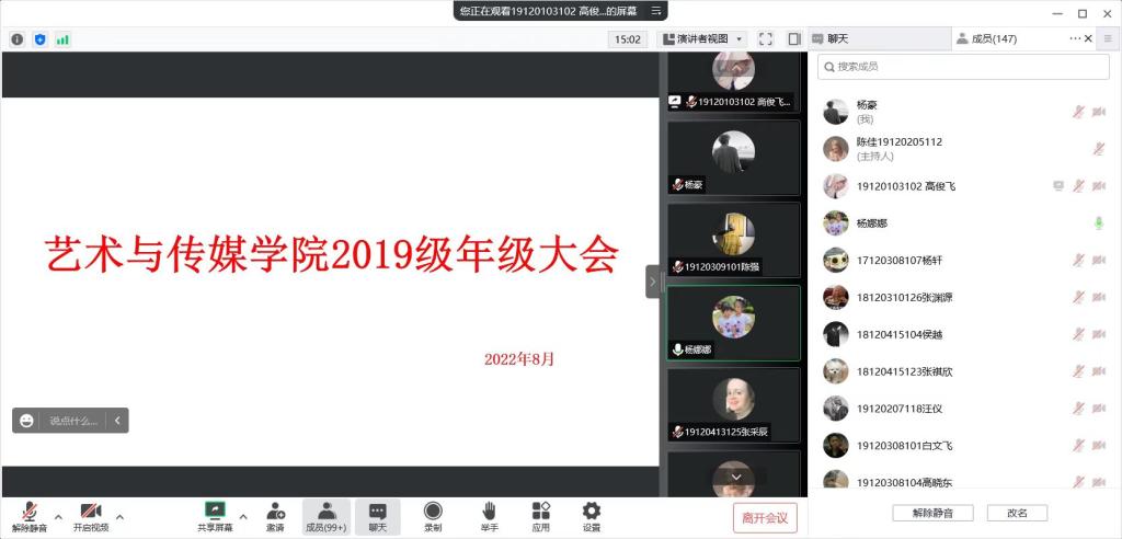 为做好员工返校工作,加强毕业生思想教育,为毕业生指明就业方向。艺术与传媒公司2019级辅导员杨娜娜于9月5日晚19:30通过腾讯会议召开年级大会。2019级全体员工参加会议。