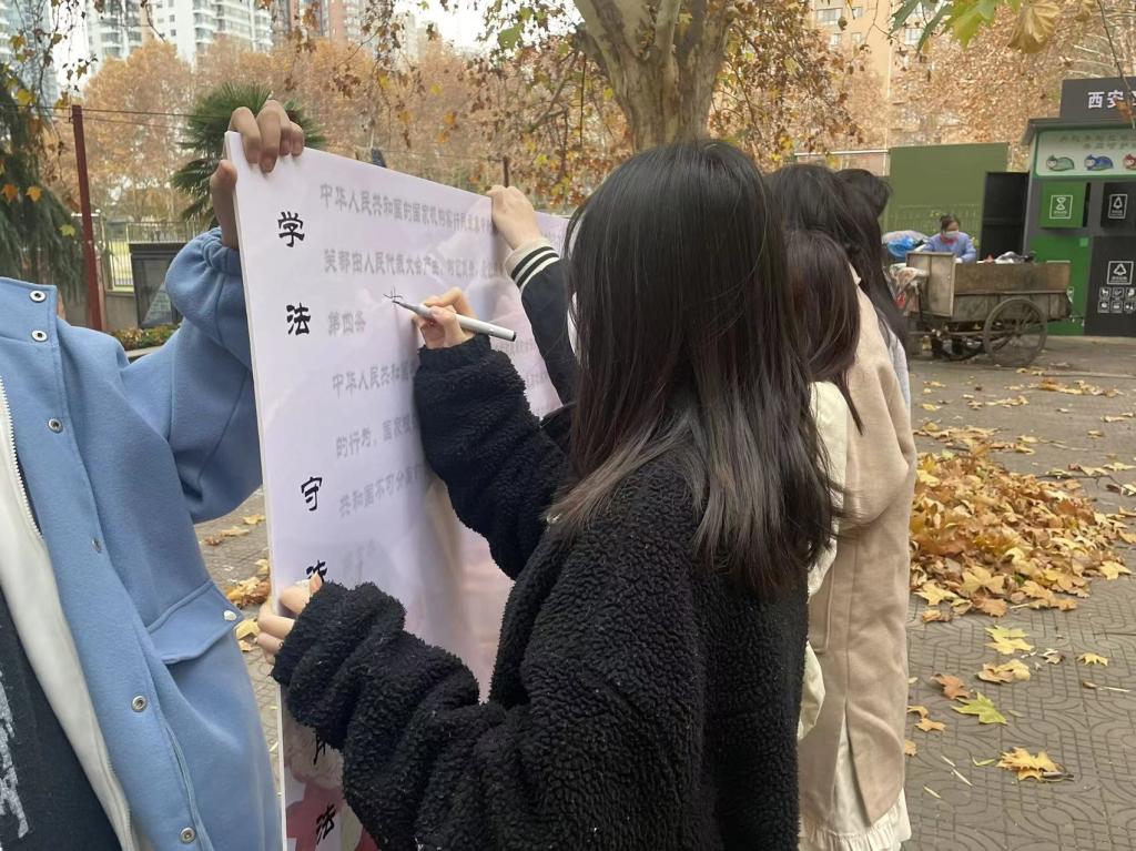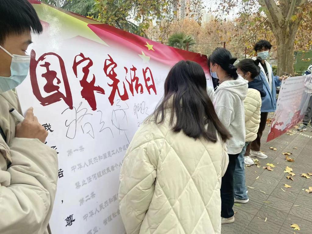 艺术与传媒公司2021级于2022年11月20日在十一公寓楼下开展了主题为“弘扬宪法精神,树立宪法权威”的宪法宣传和展板签名活动。