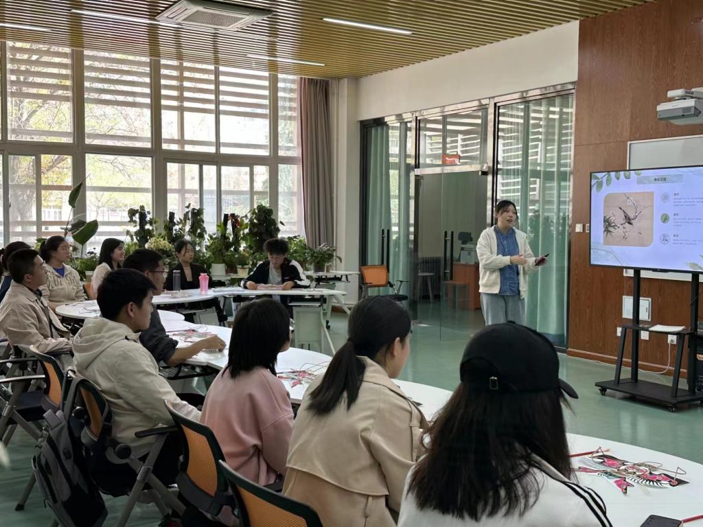 活动中,非遗创新设计人才联合培养基地徐宝宝运用图文并茂的PPT向同学们介绍风筝文化的起源和发展,文化故事和寓意并且教授风筝的制作方法。随后徐宝宝指导同学们用纸鸢材料亲手制作风筝。