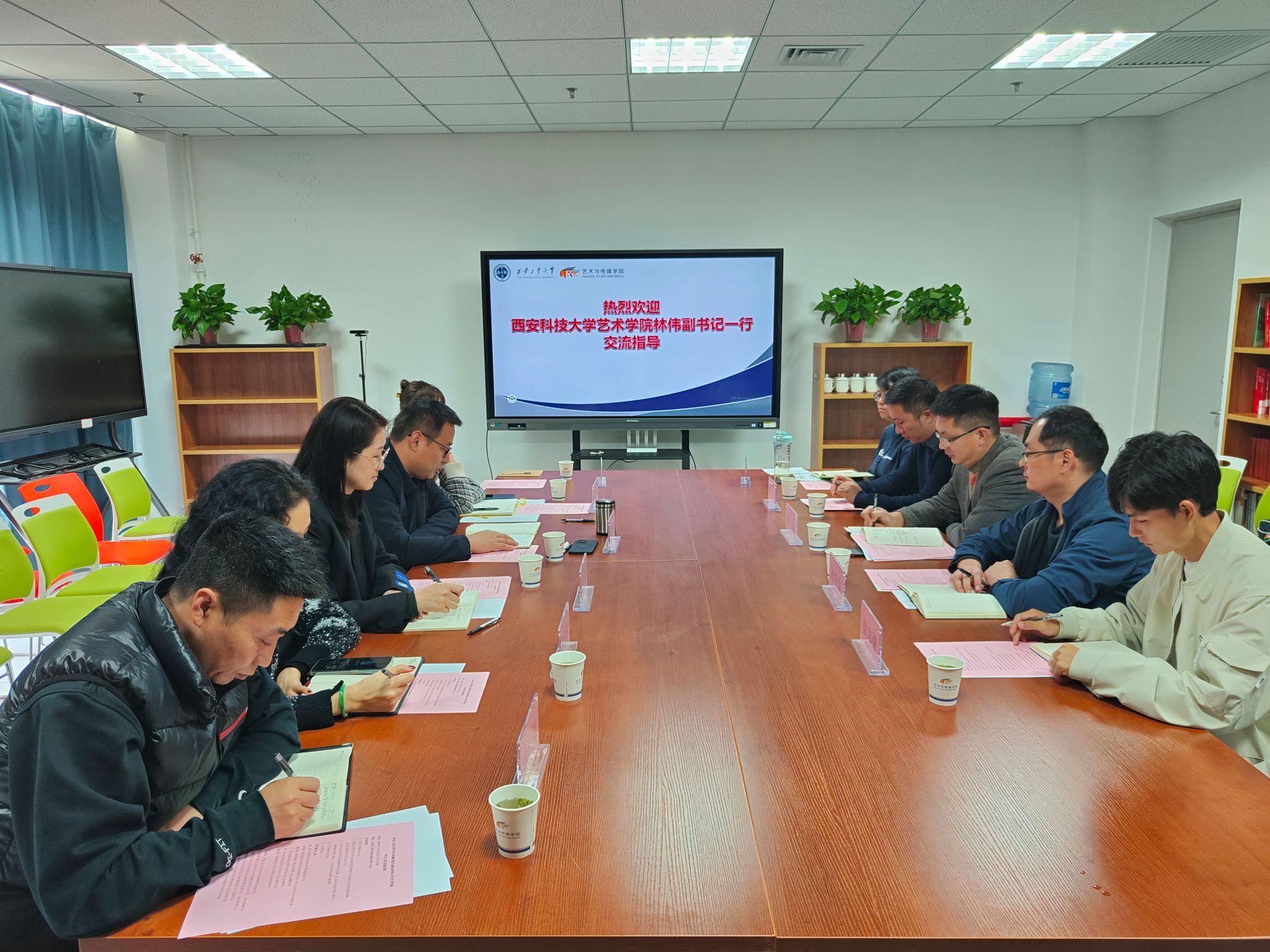 2023年10月25日下午,西安科技大学艺术公司党委副书记林伟等一行人莅临公司开展共建交流活动,公司党委副书记张晓宾以及全体辅导员参与本次交流,会议由张晓宾主持。