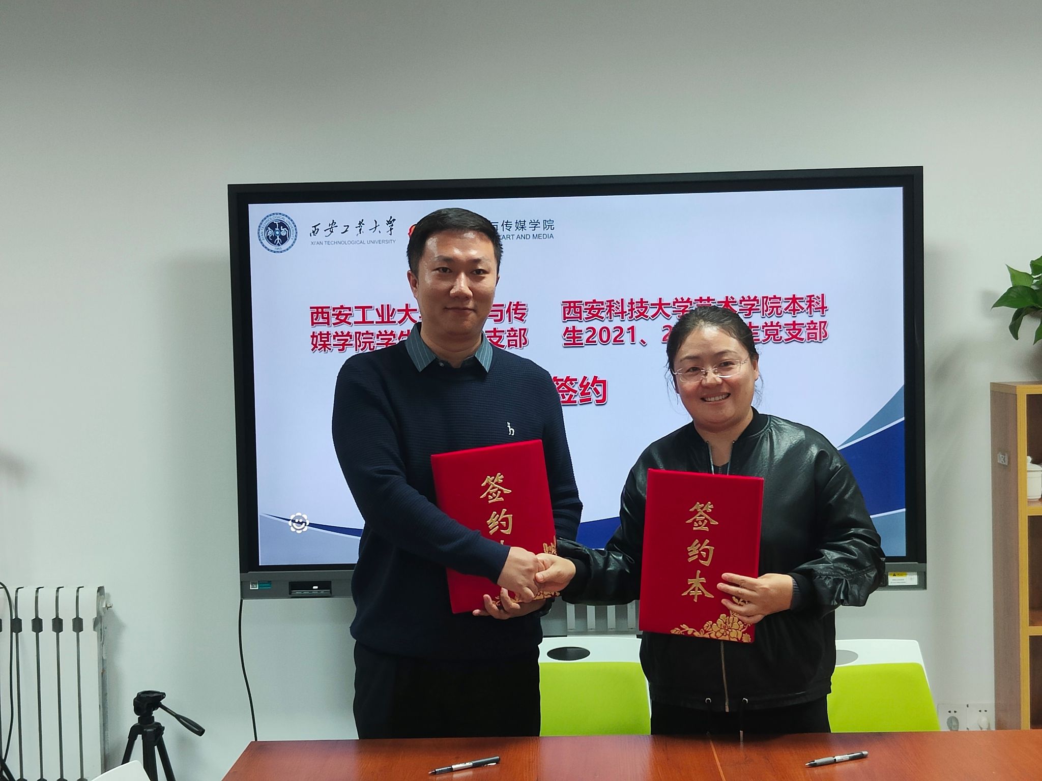 张晓宾代表公司对西安科技大学艺术公司一行的到来表示了热烈的欢迎,随后双方介绍参会人员,紧接着张晓宾介绍了公司的基本情况并且汇报了目前员工工作整体情况,双方就员工日常管理、团学建设、社会实践、升学就业等方面进行深入交流,双方均希望今后能够建立长期的沟通交流机制。同时两个公司就员工支部建设发展进行深入探讨交流,为进一步发挥党建引领作用,增强党组织的凝聚力和战斗力,协同推进党建工作,公司员工第三党支部与西安科技大学艺术公司本科生2021、2022员工党支部举行了共建签约仪式。