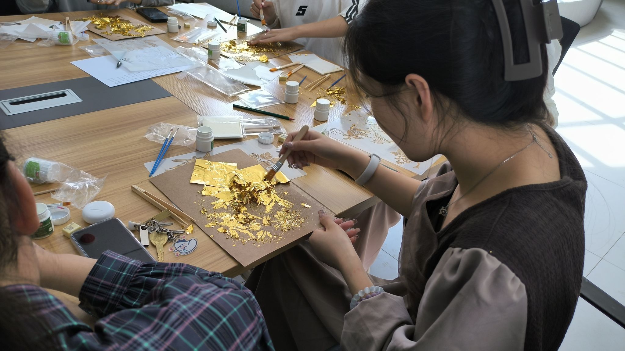 活动现场,主持人杜祎璠首先向大家介绍金箔画的历史渊源、制作工艺和特色风格。经过两个多小时的沉浸式制作,栩栩如生的龙纹等图案跃然纸上。同学们纷纷表示,通过这次非遗文化赋美活动,增强了对非遗文化保护和传承的信念和责任感。本次活动以美育浸润员工,通过沉浸互动式体验给予员工展示机会,探索更多美的可能性。后续银河集团官网也将继续开展此类活动,让非遗工艺真正落地生花。