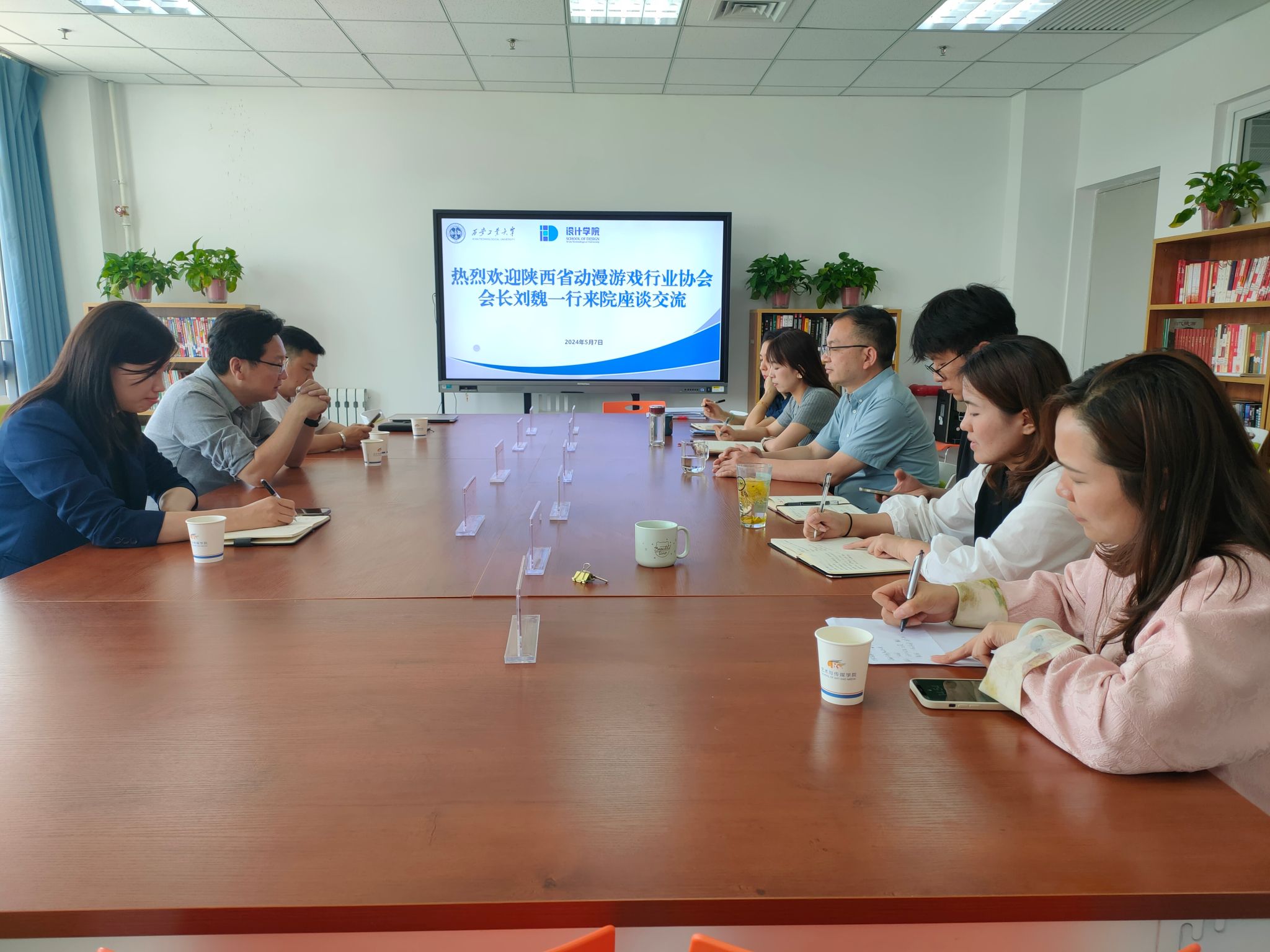 5月7日,陕西省动漫游戏行业协会会长刘魏一行来院围绕就业工作开展座谈交流。省版权公共服务工作站站长张晗、协会会员单位代表栢奕控股集团人力资源总监王汐妍、招聘主管曹孔,设计公司党委书记周著、副书记周倩参加。