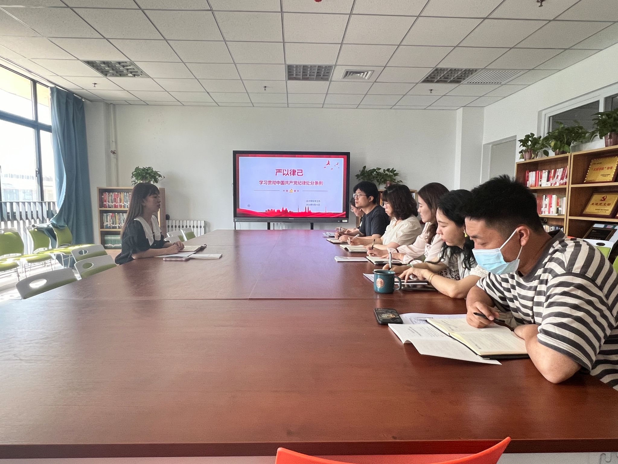 周倩首先传达了公司党委印发的《关于在全校开展党纪学习教育的工作方案》,强调了党纪学习的重要性和具体要求,同时,分享了自己参加公司党纪学习教育读书班的收获和心得。随后,全体人员集中学习了《中国共产党纪律处分条例》,深入解读其内容要点及核心精神。周倩强调,全体学工办成员要深化对《中国共产党纪律处分条例》的理解和运用,深刻认识党纪处分的严肃性,她要求全体学工办成员要逐条学、深入学,以学促用、学用贯通,在学纪、知纪、明纪、守纪中正己修身、立德担当。切实将党纪学习教育做在经常、抓在平常、融入日常,把党纪学习教育成果转化为全面推动员工工作高质量发展的强大动力。