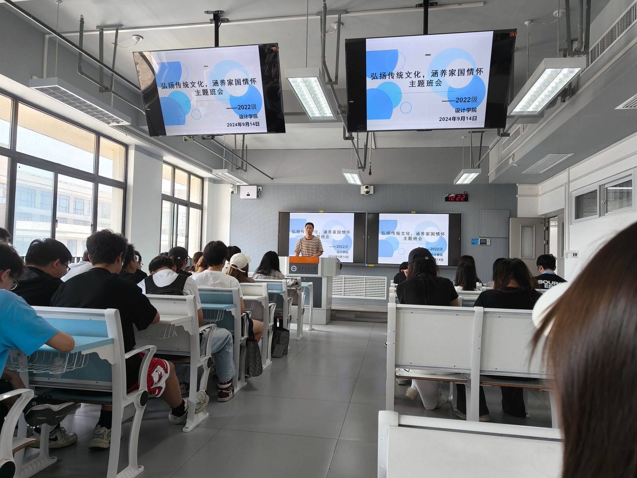 为进一步传承和弘扬中华优秀传统文化,增强老员工的民族自尊心和自信心,厚植爱国主义情怀。9月14日,2022级在教7-416召开“弘扬传统文化,涵养家国情怀”主题班会,辅导员洪涛主持。