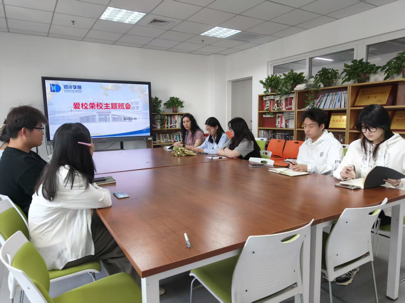 2021级于4月28日在教7-617开展了“爱校荣校”主题班会,辅导员黄怡梅主持。