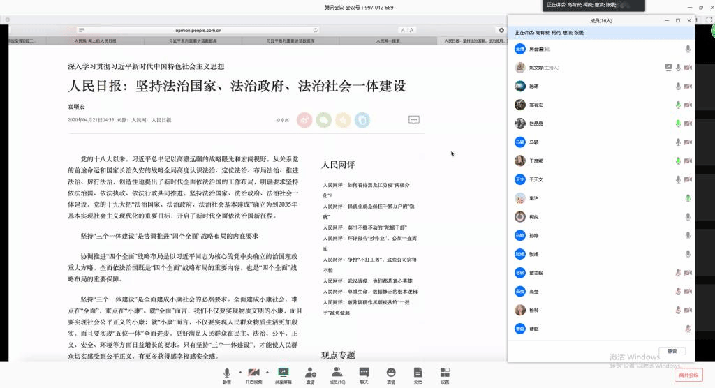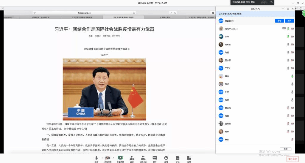 4月23日,按照《银河集团官网2020年上半年教师政治理论学习计划》要求,视觉传达设计系利用腾讯会议平台召开了政治理论线上学习会,会议由系主任姚文婷主持,公司党委委员、经理王若鸿列席,全系教师参加了学习活动。姚文婷首先领学了“团结合作是国际社会战胜疫情最有力武器”和“坚持法制国家、法治政府、法治社会一体建设”等两个重要讲话;随后,大家就学习感受进行了交流。