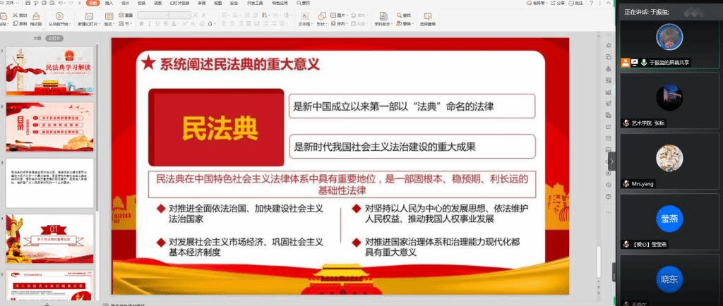 于振玺首先带领各位教师从民法典编纂的基本情况、体系价值、典范意义和实施几个方面进行学习。随后教师们发表了各自的心得与感受。张耘老师讲到:“民法典由民法总则与各分编‘合体’而来,包括总则编、物权编、合同编、人格权编、婚姻家庭编、继承编、侵权责任编及附则,共1260个条文,有效保护着每一个公民的生活。”;陈俊峰老师讲到:“民法典最鲜明的特色之一就是‘民族性’,该民族性表现在,坚持依法治国、以德治国相结合的民族特征,将‘社会主义核心价值观’写入的民族精神特征。这样做的意义,在于将我国的制度优势通过法治的方式转化为治理优势,意在将民族精神深入人心,旨在从根本上改善社会风气,给予人民最美好的生活。这也是我党深得人心的根本所在。”。