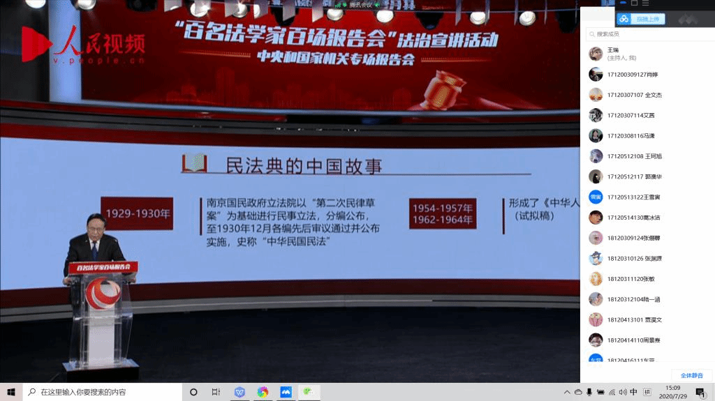 7月29日下午,艺术与传媒公司第一党支部利用主题党日活动时间,组织全体党员进行线上集中学习,本次学习主要内容为“百名法学家百场报告会”和《中华人民共和国民法典》(以下简称民法典)。