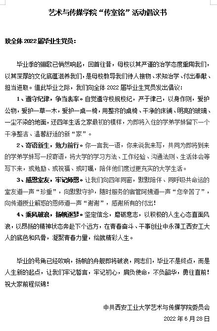 为持续加强员工党员教育,充分发挥员工党员先锋模范作用,7月初,艺术与传媒公司向2022届全体毕业生党员发出“传室铭”活动倡议,得到了全体毕业生党员的积极响应。