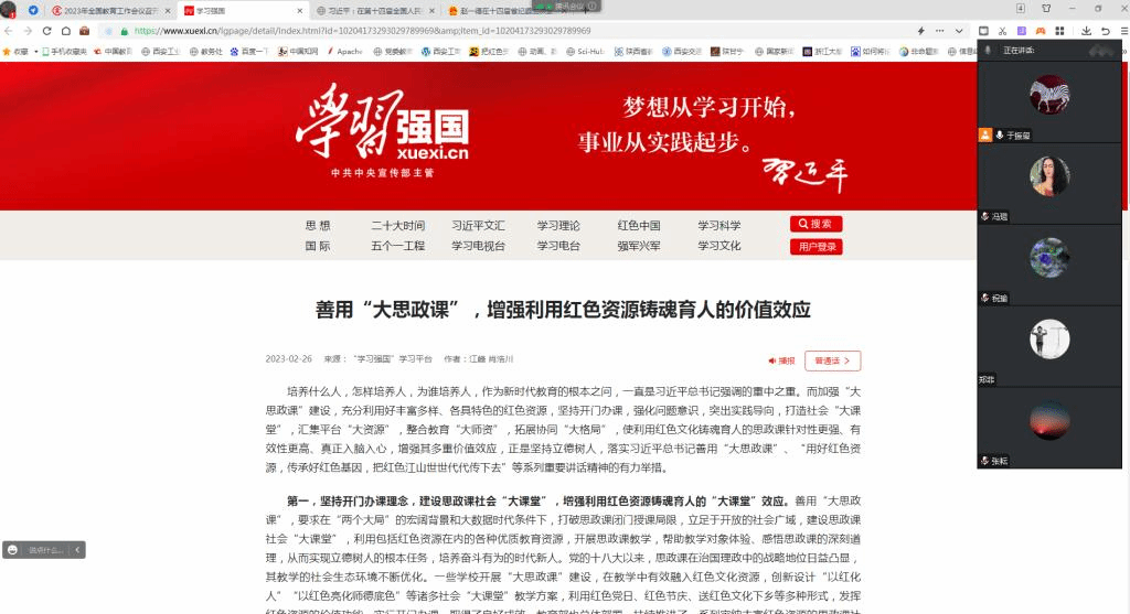会上,重点学习了2023年全国教育工作会议精神、善用“大思政课”增强利用红色资源铸魂育人的价值效应、习近平在第十四届全国人民代表大会第一次会议上的讲话精神、省委书记赵一德在十四届省纪委二次全会上的讲话精神等内容。