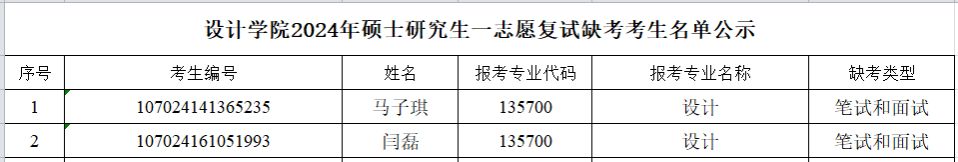 2024年硕士研究生一志愿复试缺考考生名单公示
