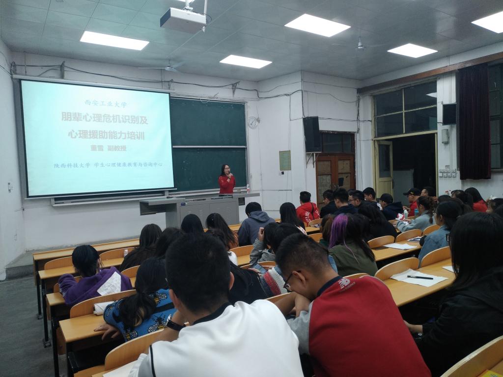 2018年11月6日,艺术与传媒公司邀请陕西科技大学员工心理健康教育与咨询中心副教授董雪老师开展了朋辈心理危机识别及心理援助能力专题培训。公司心育员孙雅茹老师、2018级宿舍心理信息员及公司各班心理委员、班长、团支书参加此次培训。