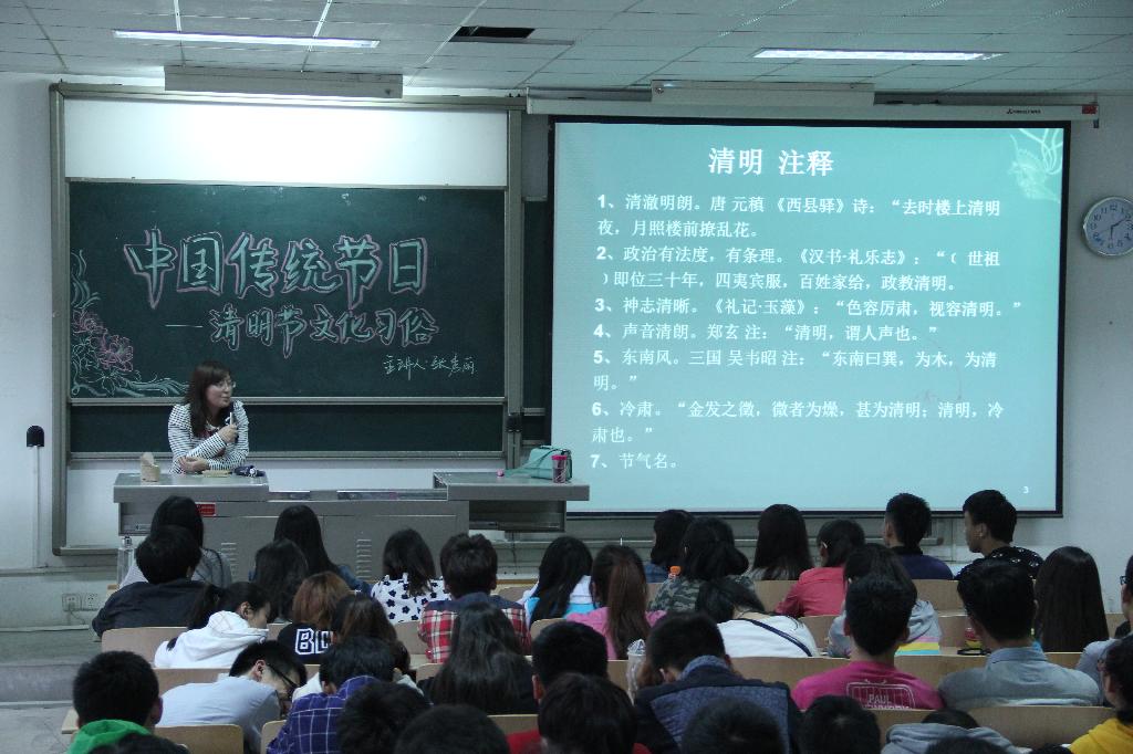 讲座开始,张秀丽老师首先向大家讲解了“清明”的注释,然后对清明进行了简要的介绍,清明始于周代,距今已有两千五百多年的历史,是我国唯一一个既是节日又是节气的日子。而后,张老师从清明节的由来展开,逐一介绍了清明节的习俗, 如:扫墓、踏青、插柳、荡秋千、放风筝等。此外还讲述了过清明节的饮食文化和外国清明节的习俗。最后,老师把大家带入了“现代清明节的思考”当中,引导我们怎样用最好的方式去表达我们对自己亲人的思念。