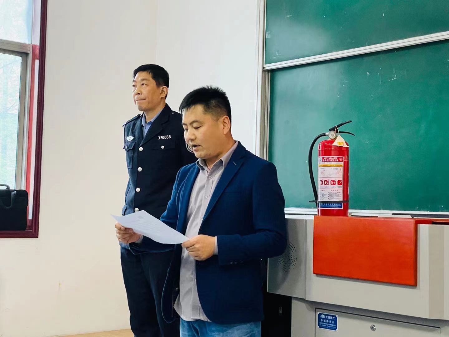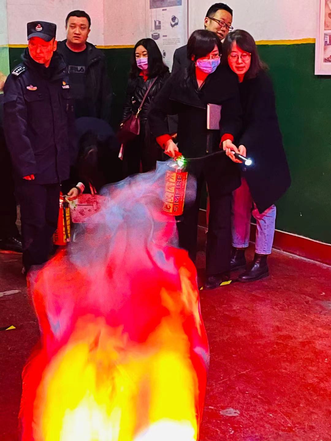 谢教官强调 “隐患险于明火,防范胜于救灾,责任重于泰山”。 谢教官现场展示消防器材及介绍使用方法和灭火器的使用方法。全体教师认真倾听并积极参与实践模拟灭火