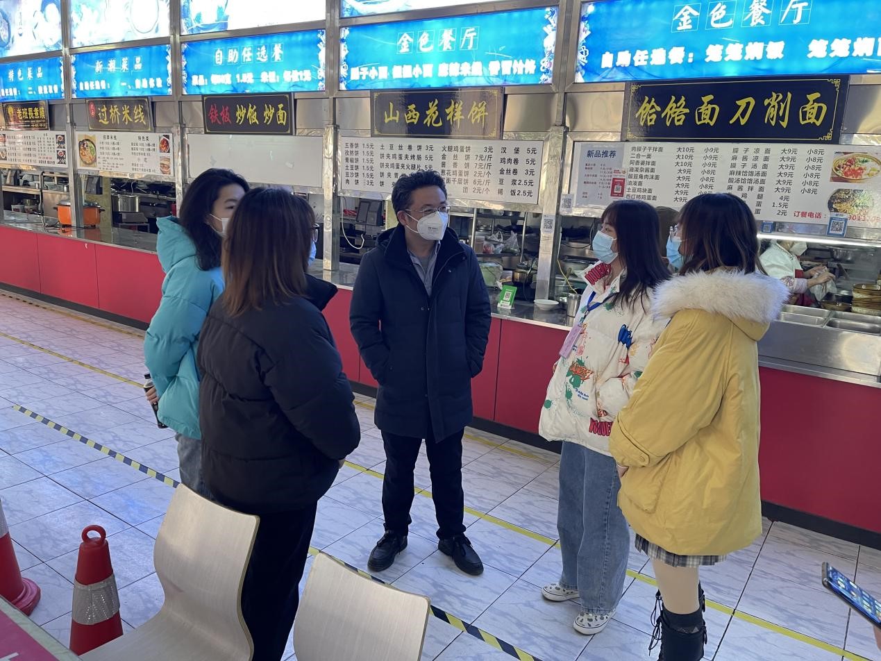 陈建首先深入金花校区餐厅,与员工志愿者深入交流,并充分肯定了他们为疫情防控做出的努力,叮嘱大家一定要做好自身防护,希望在后续防控工作中持续带头遵守各项防疫规定,积极向同学宣传疫情防控知识,充分发扬志愿服务精神。同时,祝福各位同学们节日快乐,身体健康,学习进步。