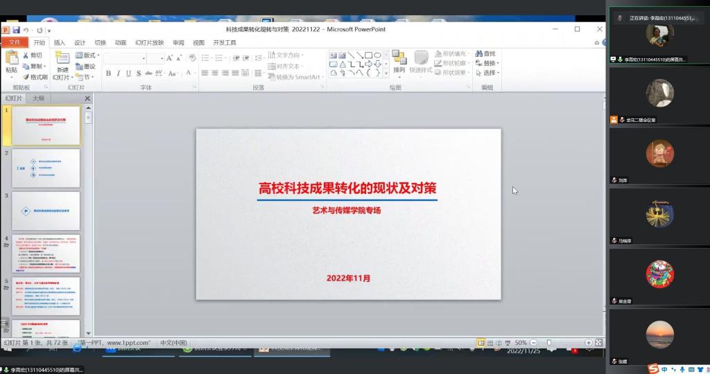 11月25日下午,公司邀请到校科学技术研究院李高宏主任在腾讯会议线上做题为“高校成果转化之现状及对策”的学术讲座,讲座由副经理刘萍主持,公司教师及研究生70余人参加了本次讲座。