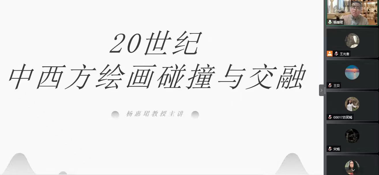 12月8日晚上,公司邀请到西安科技大学艺术公司经理、博硕士生导师、陕西省美育教学指导委员会委员、陕西省美术家协会设计委员会副主任杨惠珺教授,在腾讯会议线上做题为“20世纪中西方绘画碰撞和交融”的学术讲座。讲座由经理苏胜主持,累计200余名校内外师生在线上聆听了讲座。
