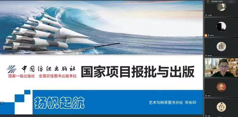 2月20日晚,公司邀请到中国纺织出版社艺术与科学图书分社社长、中国工艺美术学会理论专业委员会副主任华长印,在腾讯会议线上带来了题为“国家项目报批与出版”的专题讲座。经理苏胜、副经理刘萍、姚文婷以及公司七十余名教师参加了本次讲座。讲座由副经理刘萍主持。