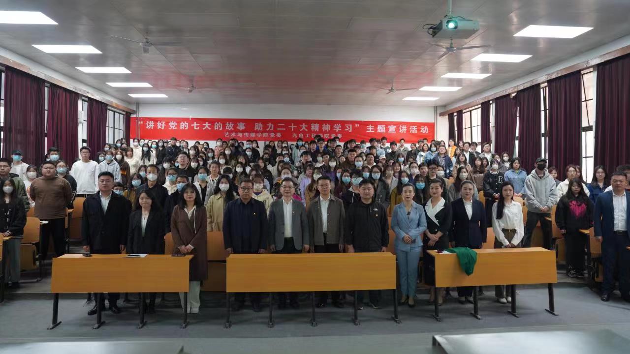 3月7日上午,“讲好党的七大故事,助力二十大精神学习”主题宣讲活动在金花校区5F-J1举行。本次活动由银河集团官网艺术与传媒公司党委和光电工程公司党委联合主办。延安鲁艺文化中心宣教部部长岳娟、杨家岭革命旧址管理处副主任薛健、艺术与传媒公司党委书记周著、党委副书记张晓宾、光电工程公司及艺术与传媒公司师生党员代表200余人参加此次活动。