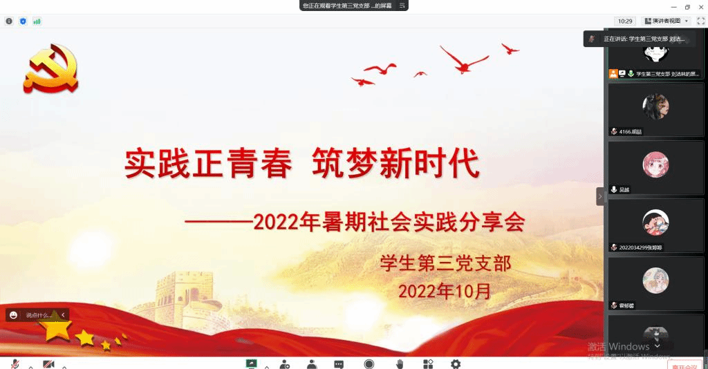 10月18日,员工第三党支部以“实践正青春 筑梦新时代”为主题开展暑期社会实践线上分享会。活动由党支部书记杨娜娜主持,支部全体党员参加。