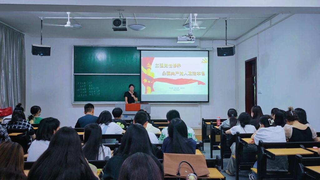 董丹丹结合中国共产党的百年奋斗史,为大家讲述了强党性的重要性、各个历史时期的具体做法及新时代新征程面临的新问题和新挑战,并从坚定理想信念、永葆清正廉洁政治本色、敢于斗争敢于胜利、把人民利益放在心中最高位置四个方面对进行解读。随后,董丹丹给毕业班党员同志做寄语:要立志高远、坚定信念,回答时代之问;要明德修身、严以律己,永葆党员初心;要笃学善思、敢于创新,书写青春华章。