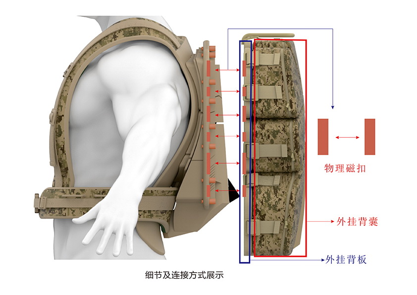 本文分别从军用背包背负和存储两个系统提炼主要的需求目标,并寻找能够与之形成相似性的生物特性。背负系统:主支撑骨架和部分辅助支撑的结合将参照蛇亚目的脊柱与肋骨,以及肌肉之间的结构体系来进行完善;存储系统:主要借鉴蛇头部和腹部鳞片分布进行功能的分配和造型提取,实践中背负系统将外架包与内架包的特点相融合,采用框架形式结合,外架框避免了背部与背包的直接接触,通风性和稳定性更佳;在贴近人体背部的部位,背负与腰带、肩带采用“S”形的设计,既可调整重心也可合理分负重力;这种外挂式的背负系统可以实现一种背负系统搭配不同的作战模块,满足不同的作战单元和需求,这种设计理念更符合课题提出的模块化存储的需求。