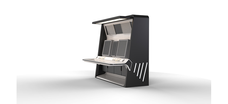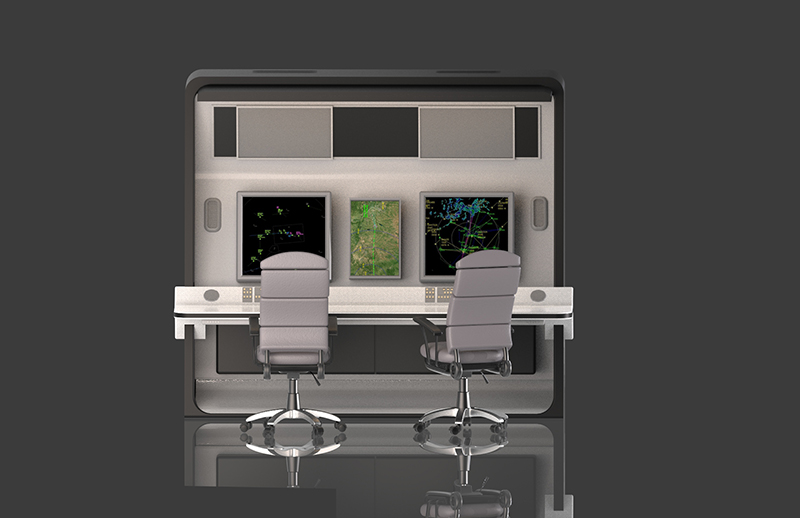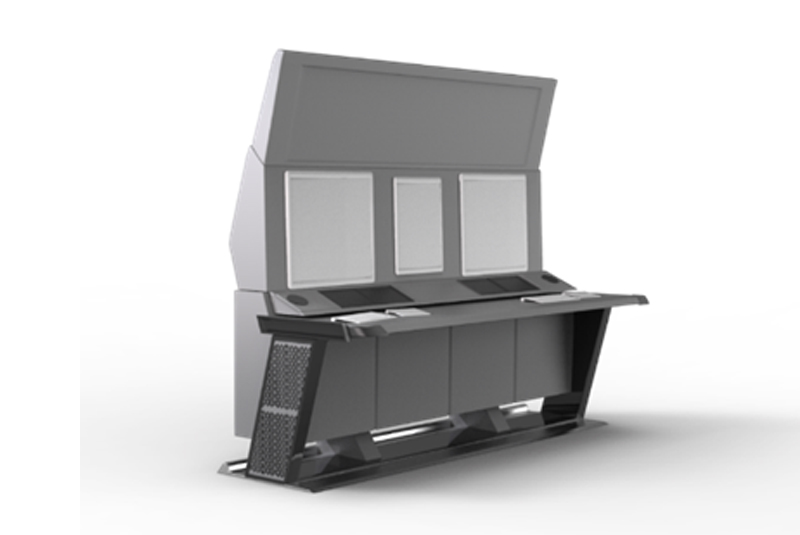 整体采用堡垒式电子雷达造型,象征着防御和进攻兼备,以防御雷达为导向,上部为可伸缩照明灯,灯光可根据环境光源改变自身的亮度,达到不反光、不刺激用户的目的,侧面增加微弱环境灯,颜色主要采用蓝色以及黑色,在稳重大方的基础上又富有现代感、科技感,彰显了空军的气质。下部采用放脚的脚踏板。配备四个主机柜,操控台侧面、顶部及后部散热,侧面增加微弱环境灯;在屏幕设计上,上屏幕采用固定式屏幕,下部3个采用可调节式屏幕,可根据用户的坐姿自动旋转更舒适的屏幕角度。内部采用模块式设计,增加了耐用性,安全性。取消了键盘,采用桌面虚拟键盘,桌面也可以根据人体坐姿有一定的升降。配备储物抽屉,抽屉中存放备用的键鼠套装。