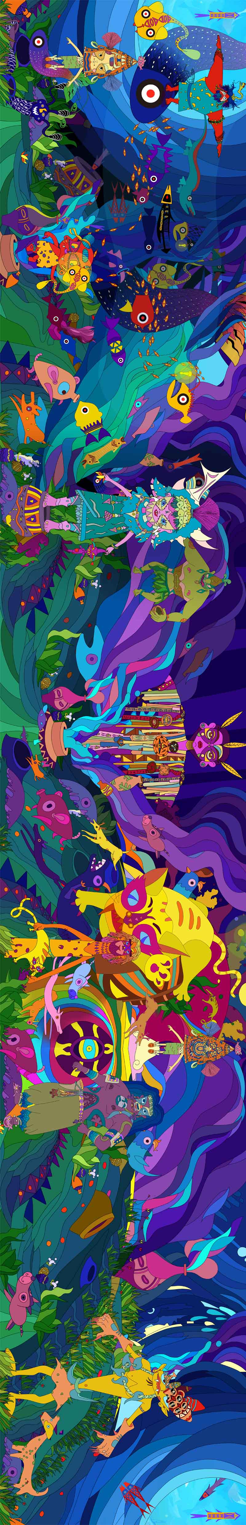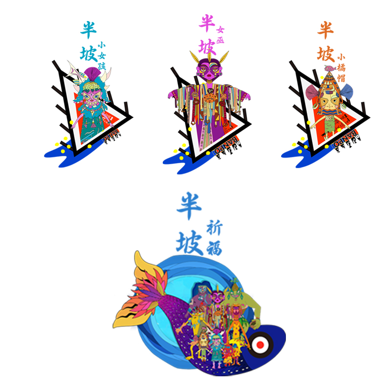 通过现代插画艺术风格进行角色、场景衍生开发设计和应用,半坡角色的衍生开发,是一种“再设计”,是对文化的重新审视、理解文化背景、融合半坡文化元素中蕴含的思想情感结合现代艺术风格,在半坡角色衍生设计一开始对于要呈现的角色形象是没有完整的概念的,很多灵感都是在草稿绘制过程中产生的,所以创作过程会不断地突破,不断地发现惊喜,改良新的角色。角色的衍生开发设计借鉴了中国传统民族文化与绘画风格,将归纳出的造型符号赋予角色。角色形象是依据原始生活中的社会分工等绘制,优化处理线条的细节,让其符合现代的审美标准,角色更加充实和有趣,具有半坡特色。半坡衍生场景以女巫为视觉中心,以水为祈福具体形式表现,连接各点组成捕鱼、祈福、狩猎、农耕等长卷绘制。根据移动媒体的流行趋势,确定画幅的长宽比以手机屏幕为主,显示比例是16:9。内容上从左往右分别是捕鱼、祈福、狩猎、农耕四个部分整体场景是一个完整首尾可拼合的整体,一方面能将整体角色更好的展现出来,另一方面传达敬畏自然与自然的和谐相处的思想观念。多样化展示了史前文化的魅力,能让更多人了解不一样的半坡文化。