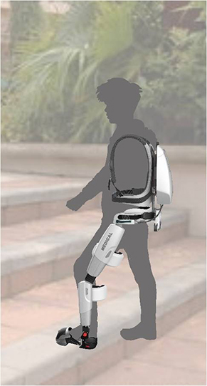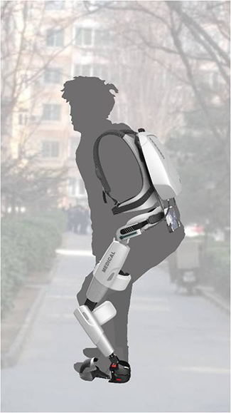 下肢康复外骨骼机器人将造型设计与功能系统相结合,对造型进行合理布局,兼具安全感和轻便感;在贴近人体背部的部位,避免了背部与背包的直接接触,背负与腰带、肩带、腿束采用软质橡胶和尼龙材质的设计,兼具支撑的柔和感和舒适感。在形态上,运用几何面及曲线对动力背包进行整体造型及模块进行分割,突出整体外观设计的简洁感;在分模方式上运用导角处理方式提升整体的精致感。在材质上,选用简洁素净、有质感的整体设计,兼具科技感和耐用感。在色彩上,整体色彩运用以白灰为基调的浅色系,体现出沉稳、柔和的感觉,让病患在使用时,体会到设计者的贴心和其中所传达的人文关怀,更有信心完成康复训练。